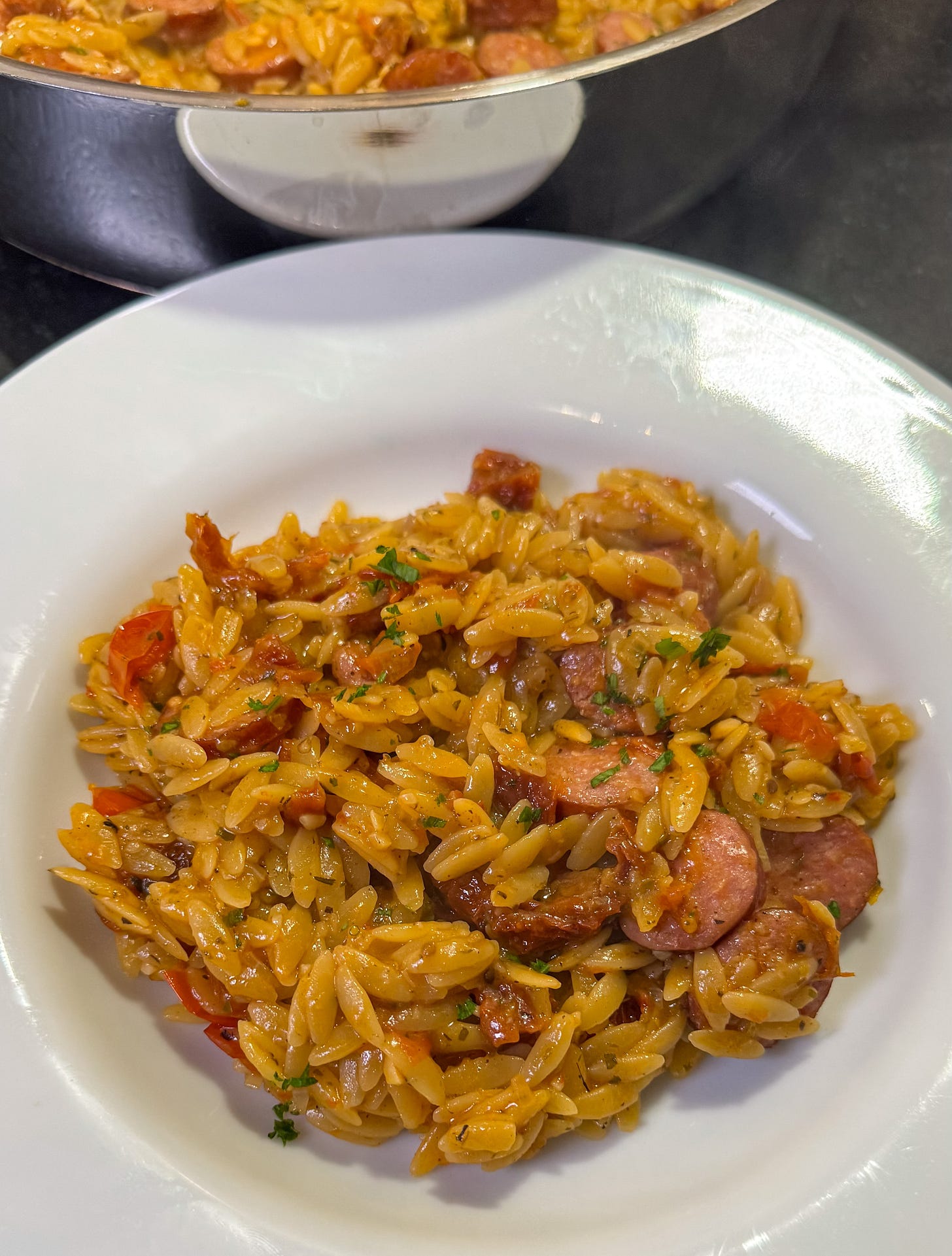 Add the orzo and cook lightly for about 2 minutes until it’s all mixed
